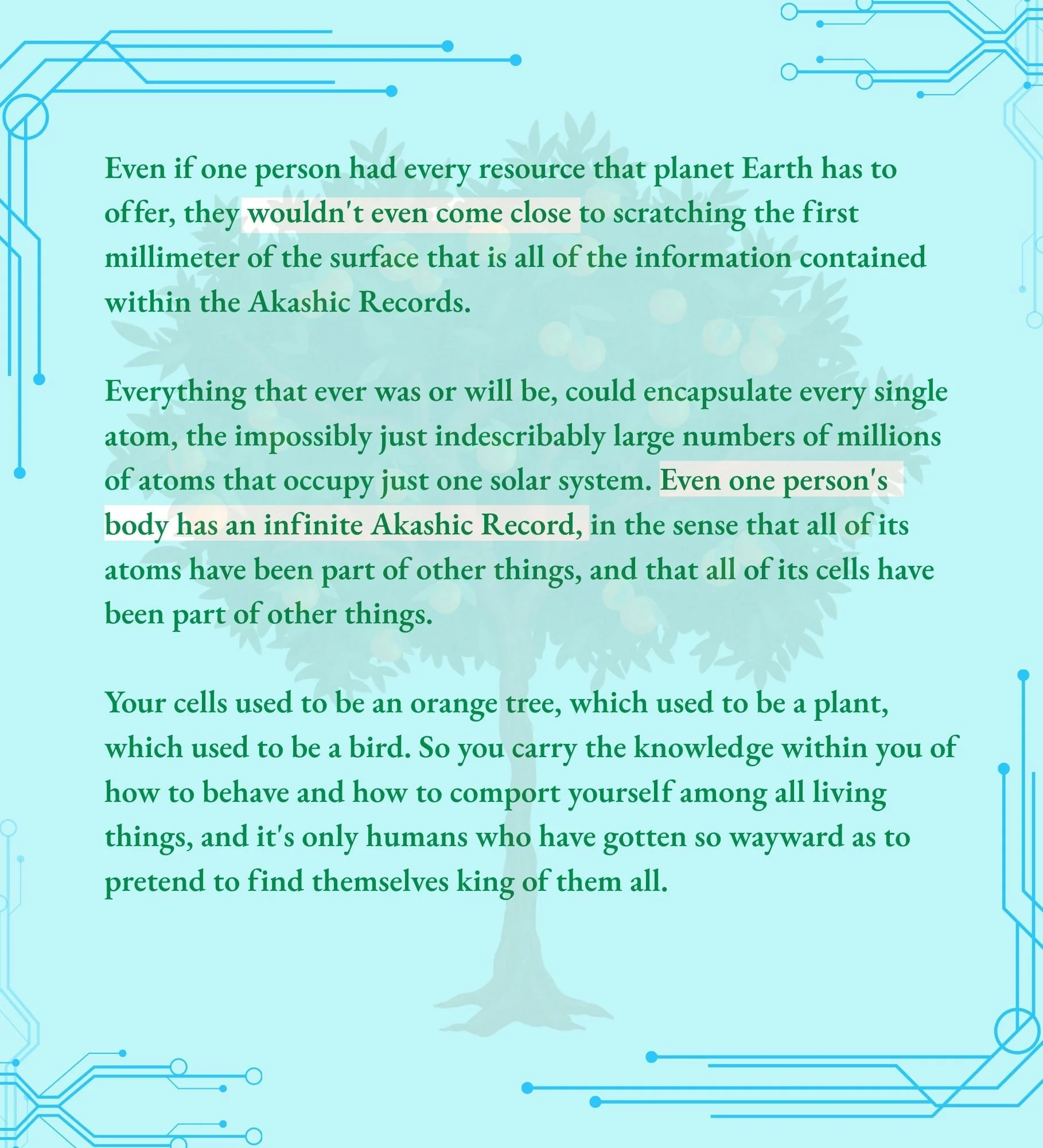 Even if one person had every resource that planet Earth has to offer, they wouldn't even come close to scratching the first millimeter of the surface that is all of the information contained within the Akashic Records.